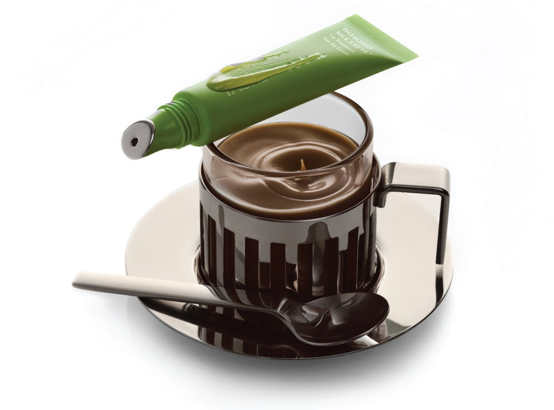 Táche pistachios, sourced from fourth-generation family farmers and long celebrated for their rich history and nutrient-dense profile, are reimagined here as a sensorial experience for the lips.